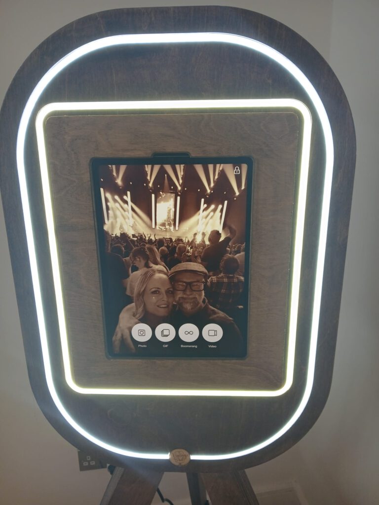Wooden with a dark oak stained effect, smaller than our Heart Selfie and with the same style tripod/easel base.